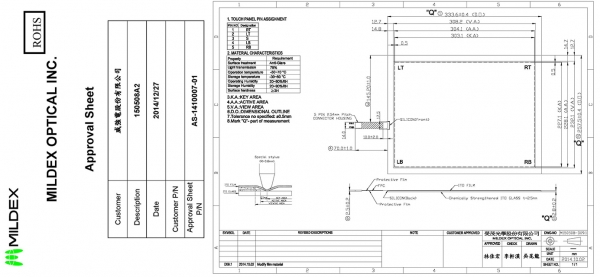 TOUCH SCREEN; ResistiveType [5 Wires]; 15"; MILDEX; 150508A2; FPC; 70mm; DUPONT 5PIN PITCH:2.54; 2.5mm; NO ADHESIVE; RoHS