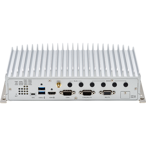 Fanless Edge AI System, Nvidia Jetson Orin Nano (Super) 6-Core SoM, Ampere 1024-Core GPU, 8GB LPDDR5 RAM, 128GB NVMe SSD, HDMI, 8xM12 PoE+ LAN, 2xUSB 3.2, 1xOTG, 2xCOM, 1xDB15 Multiport (8-bit DIO, CAN), 1xM.2 Key-B, 1xM.2 Key-E, GPS, 24VDC-in Rail