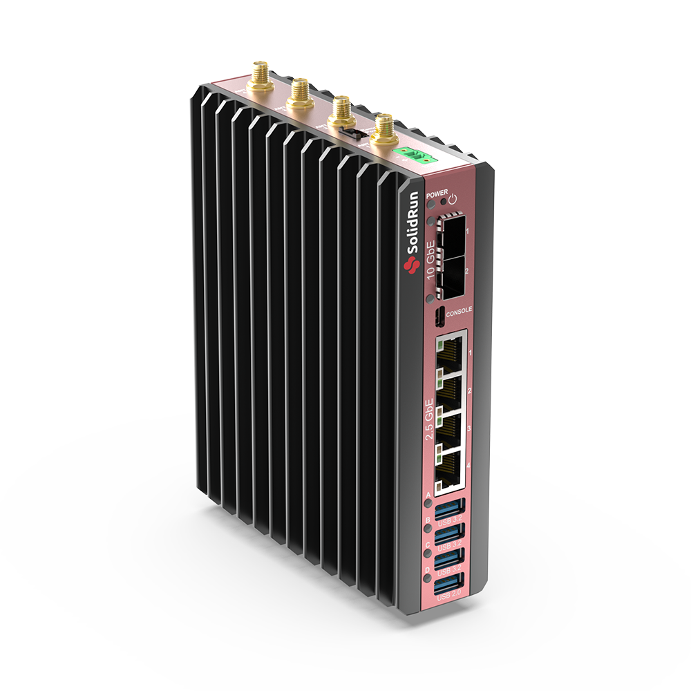 Fanless DIN-Rail Bedrock PC, AMD Ryzen Embedded V3000 CPU, up to 30W TDP, up to 64GB DDR5 SO-DIMM RAM, 2x10GbE LAN, 4x2.5GbE LAN, 3xM.2 2280 NVMe, 1xM.2 for WiFi/BT, 1xM.2 for 4G/5G, 3xUSB 3.2, 1xUSB 2.0, 12-60V DC-in, 0..70C (wide temp. optional)