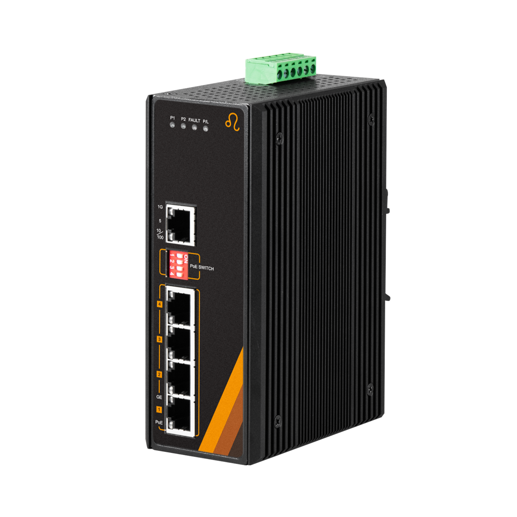 Industrial Managed Gigabit Ethernet PoE Switch, IP30, 4x10/100/1000Base-TX with PoE, 1x10/100/1000Base-TX, Dual 48..55VDC, Operating Temperature -10..65 C