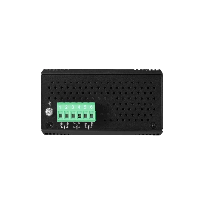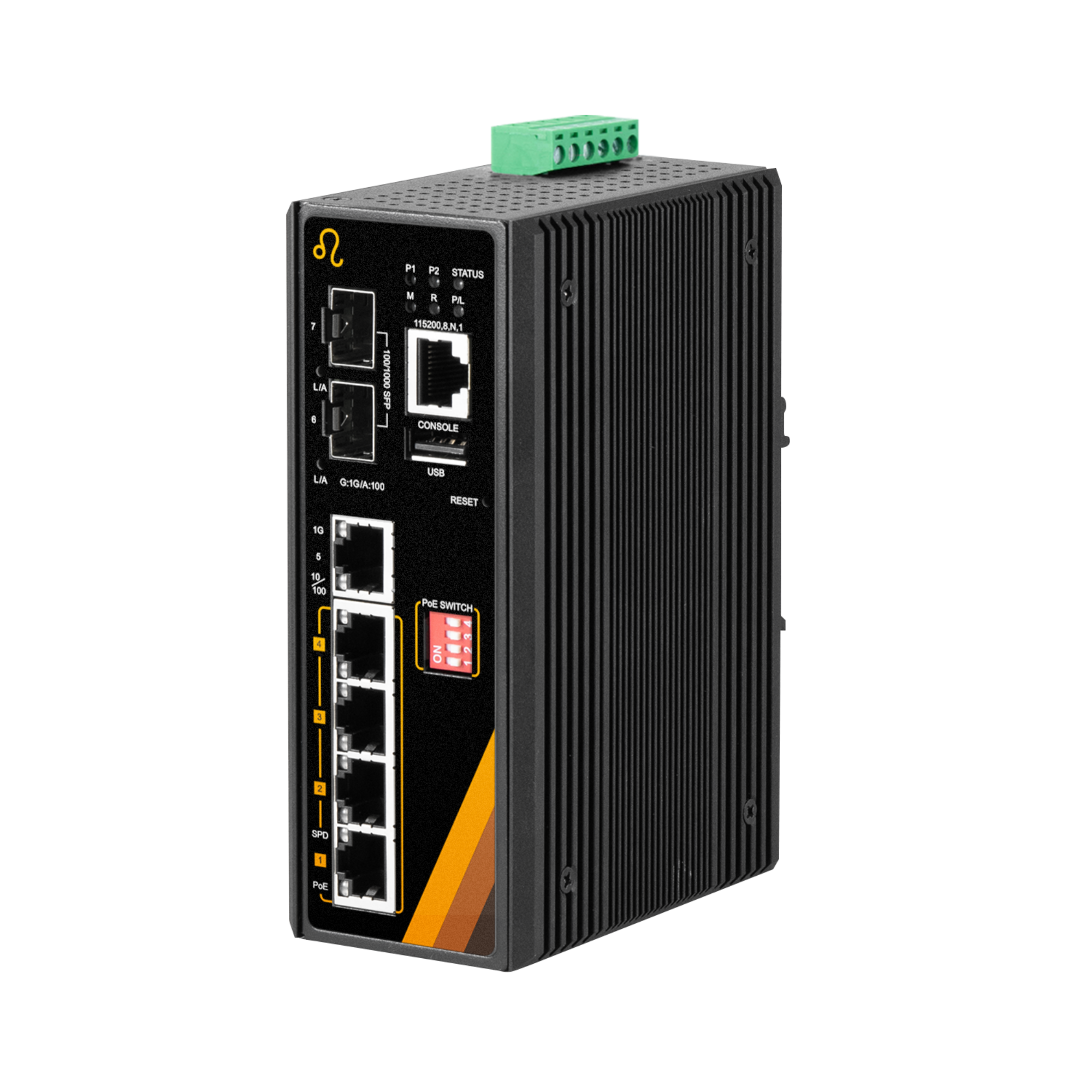 Industrial Managed Gigabit Ethernet PoE+ Switch, IP30, 4x10/100/1000Base-TX with PoE, 1x10/100/1000Base-TX, 2x100/1000Base-FX SFP, 1xCOM, Dual 48..55VDC, Operating Temperature -10..65 C