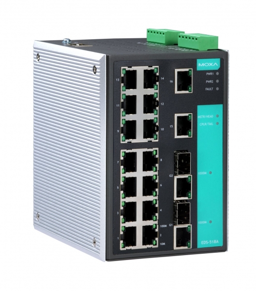 Industrial Managed Redundant Ethernet Switch with 16x 10/100 BaseTx Ports and 2x 10/100/1000 BaseTx Ports, RoHS