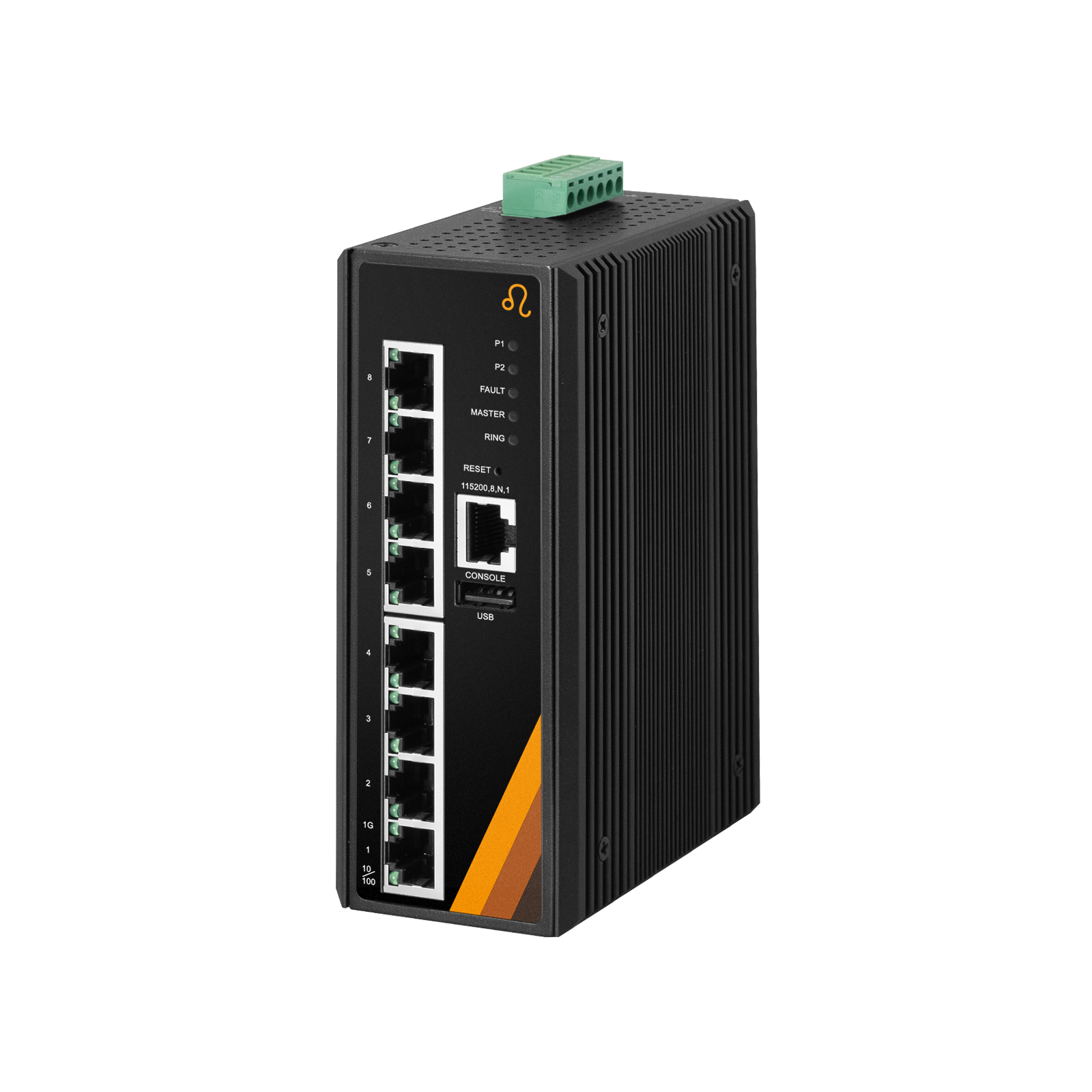 Industrial Ethernet Switch, IP30, 8x10/100/1000Base-TX, 1xCOM, Dual 12..48VDC, Operating Temperature -10..65 C