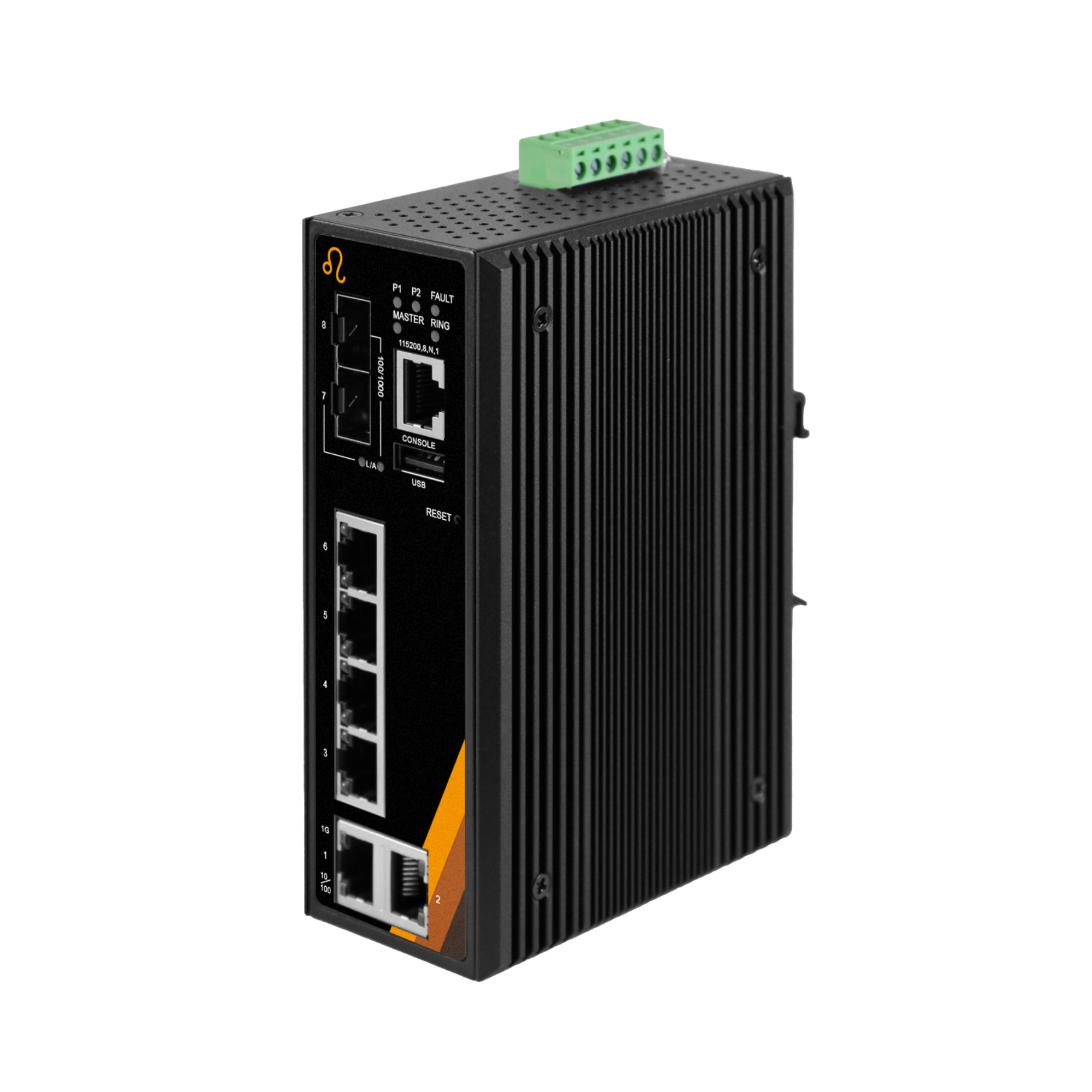 Industrial Ethernet Switch, IP30, 6x10/100/1000Base-TX, 2x100/1000Base-FX, 1xCOM, Dual 12..48VDC, Operating Temperature -10..65 C