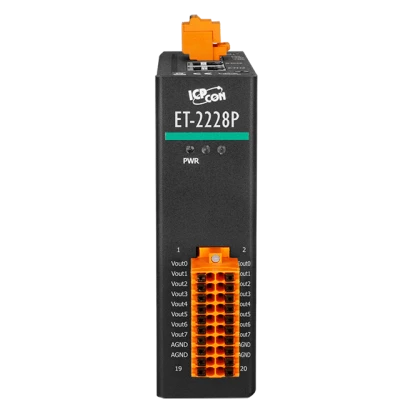 Ethernet I/O Module, 2x10/100Base-TX, 8-channel differential analog outputs 0..5V/0..20mA/4..20mA, 10..48VDC, Operating Temperature -25..75C