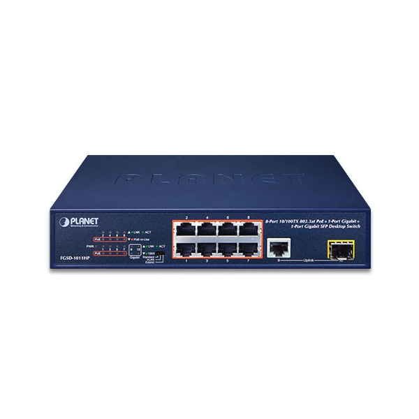 Desktop Switch with 8x10/100 Base-TX PoE Ports, 1x100/1000 Base-T Ports, 1x100/1000 Base-X SFP Ports, 100..240V AC, 0..+50C Operating Temperature