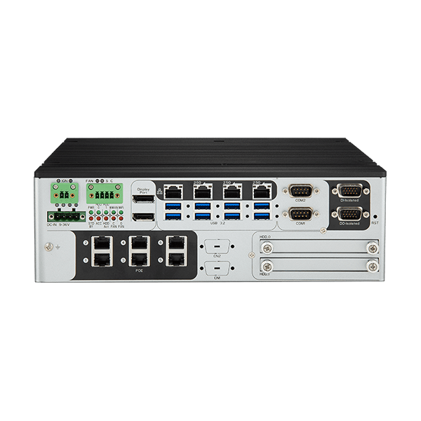 Fanless Edge AI Box PC, Intel 13/14th Gen Core i3/i5/i7/i9 CPU, R680E, Up to 64GB DDR5 RAM, 2xDP/HDMI/DVI-I, 4xGbE LAN, 8xUSB 3.2, 2xCOM, 16-bit DIO, 1xMXM 3.1, 2x2.5" Bay", 2xMiniPCIe, 1xM.2 Key-B, 1xM.2 Key-E, 1xPCIe x8 Slot, Audio, 9-36VDC-In