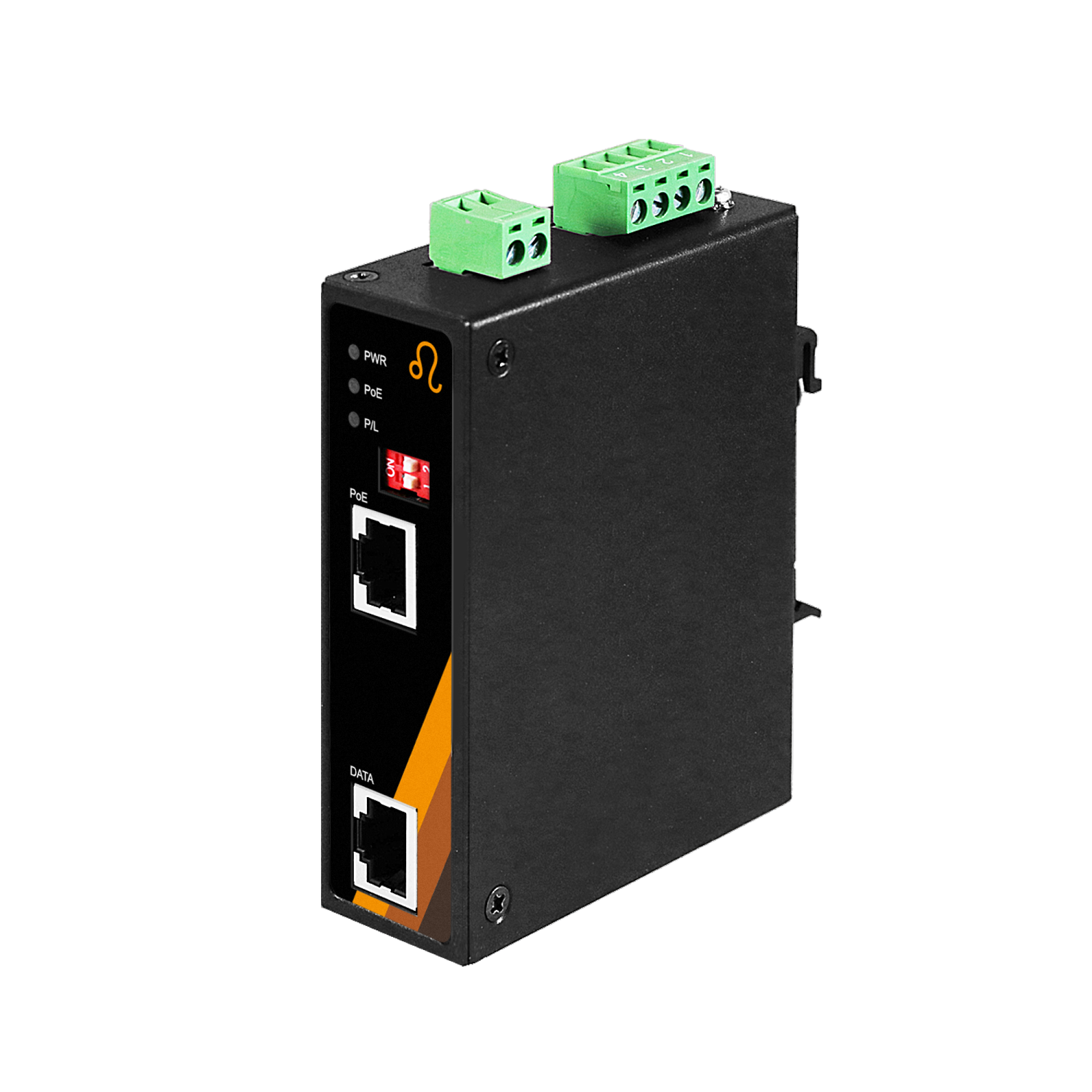 Industrial Gigabit PoE+ Injector, IP30, 1x10/100/1000Base-TX with PoE-PSE, 1x10/100/1000Base-TX, Dual 48..55VDC, Operating Temperature -40..75 C