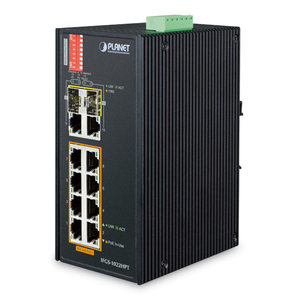 Industrial Power-over-Ethernet DIN-Rail Switch with 8x100Mbps 802.3at PoE+, 2x1000 Mbps TP/SFP, 250m Extend mode, -40...+75C operating temperature, Dual redundant DC 48-56V Power Input