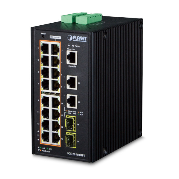 Industrial Power-over-Ethernet DIN-Rail Managed Switch with 16x1000 802.3at PoE, 2x1000X SFP, 2x1000 Base(T), DIDO, ERPS Ring, 1588, ONVIF, -40...+75C operating temperature, Dual DC 48-56V Power Input