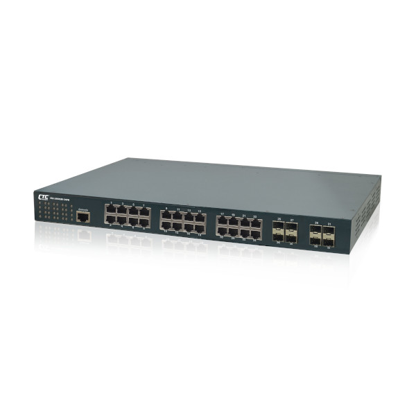 Managed Gigabit L2 Ethernet Switch, IP30, 24x10/100/1000Base-T with PoE, 8x100/1000Base-X SFP Ports, 1xCOM, Redundant dual 44..57VDC Input Power, -10...60C Operating Temperature
