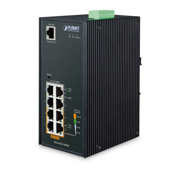 Industrial Power-over-Ethernet DIN-Rail Managed L2+, L4 Switch with 4x1000 802.3at PoE, 4x1000 BaseT, -40...+75C operating temperature, Dual Redundant DC 48-56V Power Input