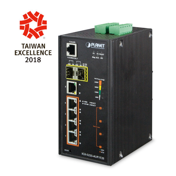 Industrial Power-over-Ethernet DIN-Rail Managed L2+, L4 Switch with 4x1000 Base T Ultra PoE+, 1x1000 Base T, 2x1000 Base X SFP, 60W, -40...+75C operating temperature, Dual Redundant DC 48-56V Power Input