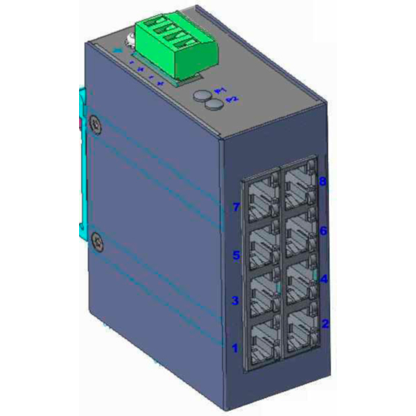 Industrial 8-port DIN-Rail Unmanaged Fast Ethernet Switch with 8x100 Base-TX ports, -40...+75 C operating temperature, +12...+58VDC-in, Redundant DC Power Input