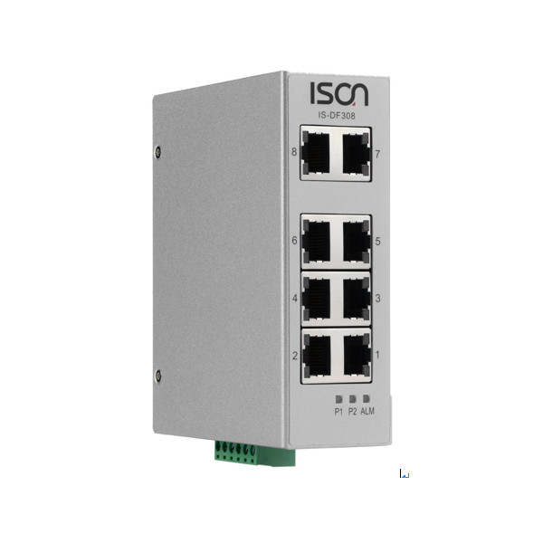 Industrial 8-port DIN-Ral Unmanaged Ethernet Switch with 6x 100 Base-TX ports and 2x 100 Base-FX SFP Slots, -40..+75 C operating temperature, +12...+58VDC-in, Dual DC Power Input