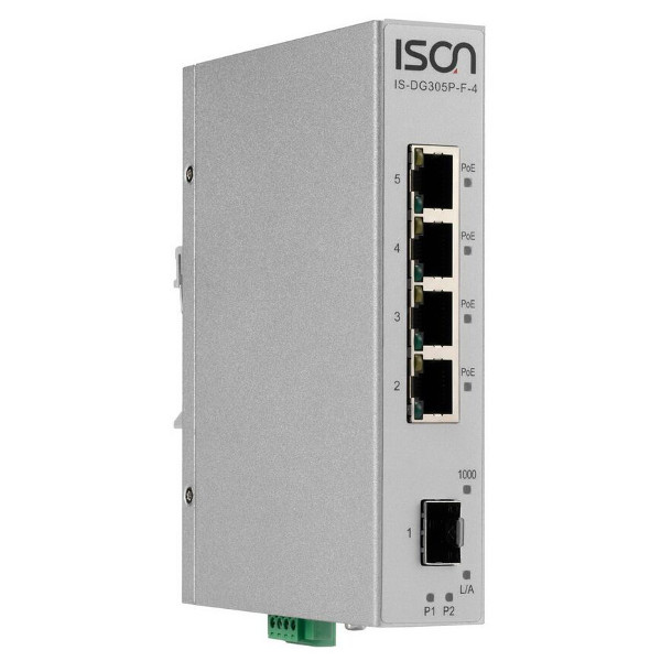 Industrial DIN-Rail Unmanaged 5-port IEEE802.3af/at Power-over-Ethernet Switch with 4x 1000 Base-TX ports and 1x 1000 Base-FX SFP Slots, 4 PoE output(max. 30W per Port), -40...+75 operating temperature, Dual DC