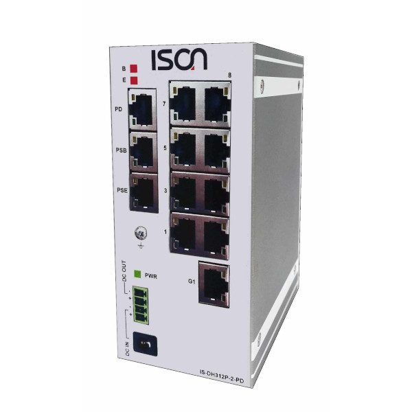 Industrial Din-Rail Unmanaged 12-ports PoE Ethernet Switch with 8x 100 Cooper ports, 1x1000Mbps FX port, 1x1000Mbps PD, 2x1000Mbps PSE port(1xPSE, 1xPSD, Power Budget 60 Watts), Dual 12-58V DC-In, -40...+75 C operating temperature