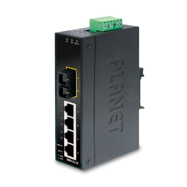 Industrial DIN-Rail Fast Ethernet Unmanaged Ethernet Switch, 4x100 Base(TX),1xBase(FX), Multi Mode, 2km distance, Redundant 12-48VDC, -40..+75C Operating Temperature