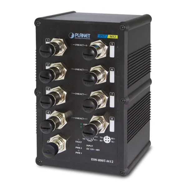 Industrial IP67 DIN-Rail Unmanaged Switch with 8x100 Mbps ports, redundant 12-48VDC Power Input, -40...+75C operating temperature
