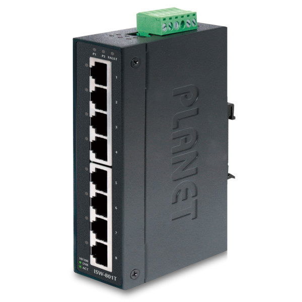 Industrial DIN-Rail Fast Ethernet Unmanaged Ethernet Switch, 8x100 Base(TX), 6KV protection, 12-48VDC/24VAC redundant Input Voltage, -40..+75C Operating Temperature