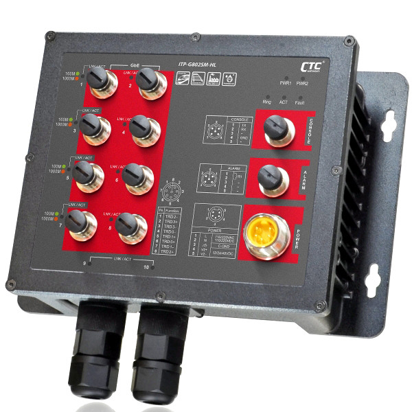 Managed Ethernet Switch with 8x 10/100/1000 Base-TX (X-code) Ports, 2x 100/1000 Base-X SFP Slots, EN50155 Certification, Redundant Dual 12/24/48VDC and 110/220VDC/VAC Input Power, IP67, -40..+75C Operating Temperature