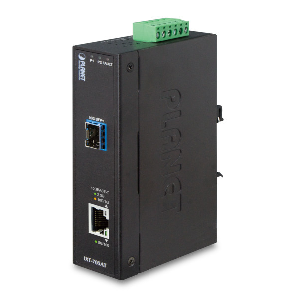 Industrial 10G Ethernet Converter, 10G Cooper to 10G Base-X SR/LR SFP+, 6kV protection, redundant 12-48V DC/24V AC, -40..+75C operation temperature