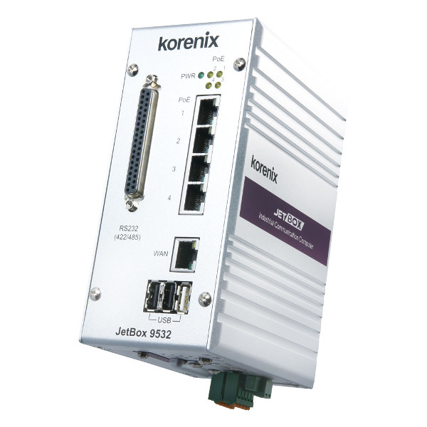 Korenix PoE Routing Server Intel Xcale IXP435 RISC 667MHz, 4xPoE LAN, 1xLAN/WAN, 4xCOM, 3xUSB, 8xDIO, 12..+48DC-In