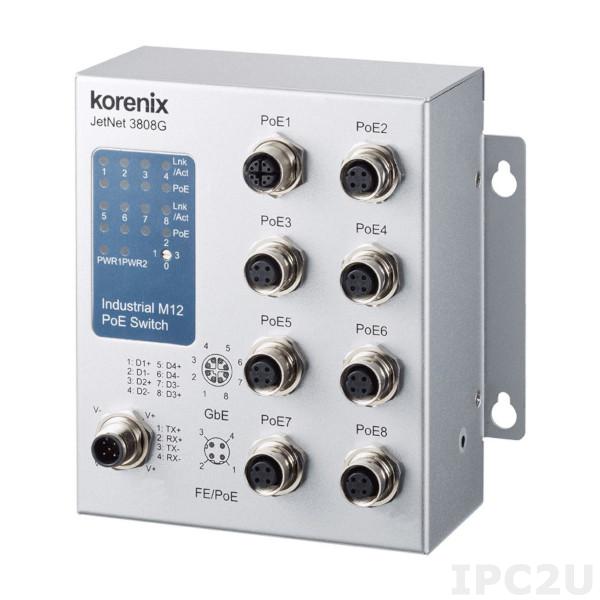 Industrial Unmanaged PoE Booster Switch w/ 7x100Mbps PSE M12 D-code ports, 8/1x1000 Mbps PSE M12 X-code port, IEEE 802.3af/at, 120W PoE budget, 12-24V DC In, -40..+75C operation temp., EN50155, EN50121-4, eMark E13