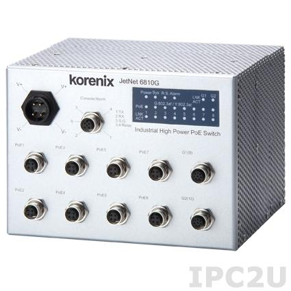 Korenix Industrial Managed 8x10/100Base-TX PoE Ethernet (M12-D-Code-4 Female IP67 Connectors) Switch with 2x1000Base-TX Ports (M12-A-Code 8pim Female IP67 Connector), Isolated 24V to 57V DC PoE Booster