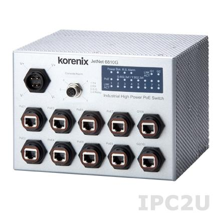 Korenix Industrial Managed 8x10/100Base-TX PoE Ethernet (Rugged IP67 RJ45 Connectors) Switch with 2x1000Base-TX Ports (Rugged IP67 RJ45 Connector), Isolated 24V to 57V DC PoE Booster