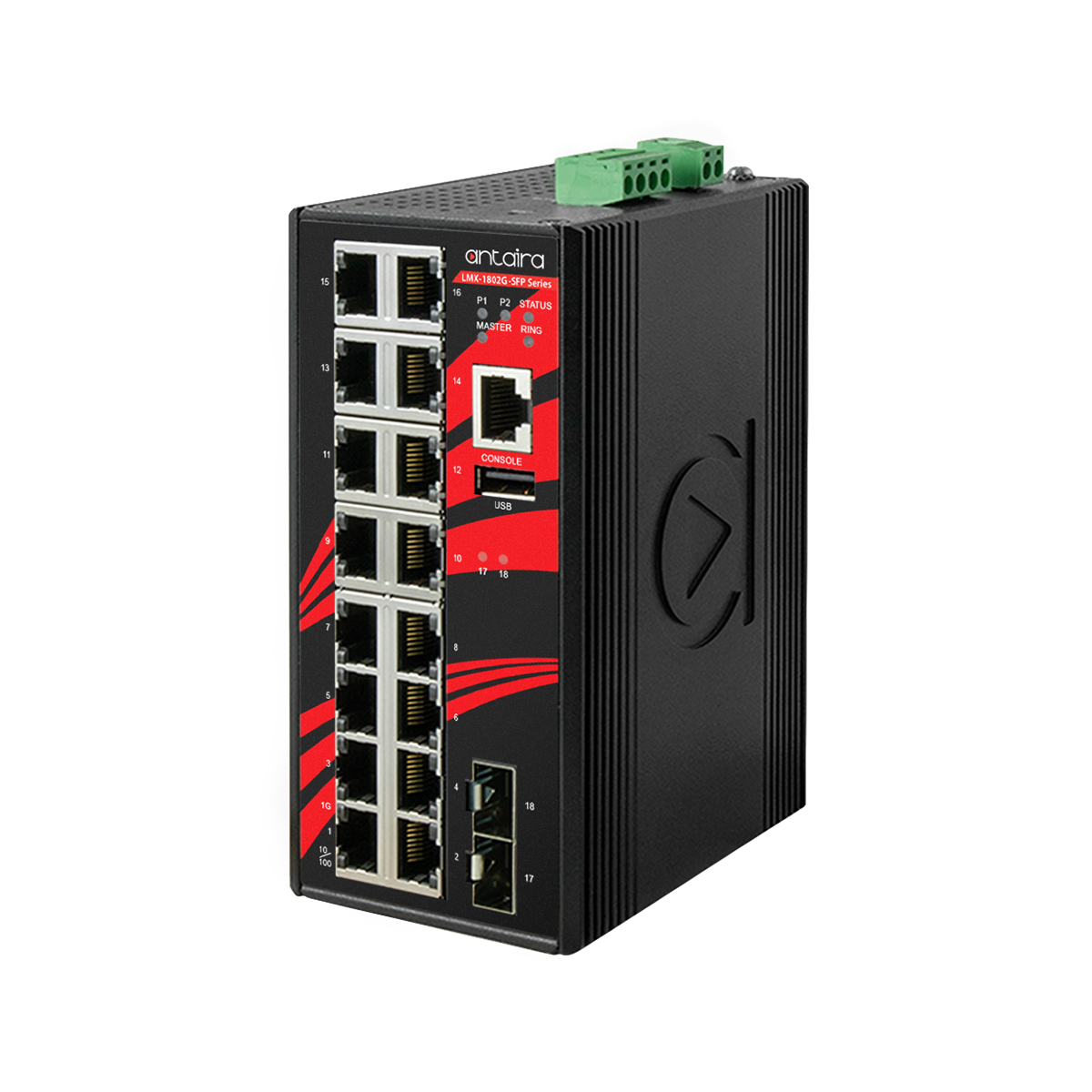 Industrial Layer 3 Managed Ethernet Switch, IP30, 16x10/100/1000Base-TX, 2x100/1000Base-X SFP, 1xUSB, Power Input 12..48 VDC, Operating Temperature -40..75 C