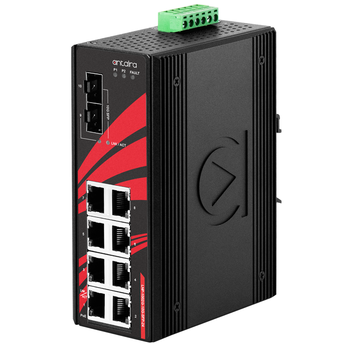 Industrial PoE+ Unmanaged Ethernet Switch, IP30, 8x10/100/1000Base-TX with PoE+, 2x10GbE SFP+, 12..55VDC, Operating Temperature -40..65 C