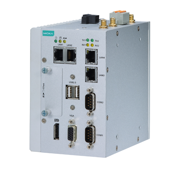 x86 embedded computer with Intel Atom quad-core E3845 processor 1.91GHz, 4GB RAM, VGA, DP, 2xUSB, 4xGigaLAN, 2xCOM, 4xDI/4xDO, CFast socket, SD slot, 12...36VDC power, -40...+70C