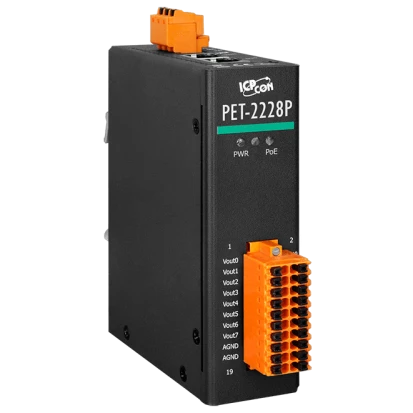 Ethernet I/O Module, 2x10/100Base-TX with PoE, 8-channel differential analog outputs 0..5V/0..20mA/4..20mA, 10..48VDC, Operating Temperature -25..75C
