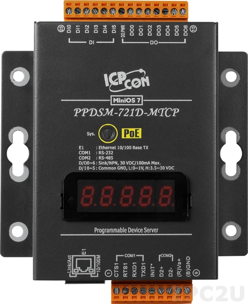 Programmable Device Server with PoE, Modbus Gateway, 1 RS-232 port, 1 RS-485 port and an LED Display with Metal Case