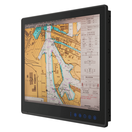 19" Fanless Marin ECDIS Panel PC, IP66 Front, 1280x1024, 350 cd/m2, AR Coating, PCAP Touch, Intel Core i5-1335U CPU, 8GB DDR5 RAM, 128GB NVME SSD, HDMI Opt., 2xGbE LAN, 2xUSB 3.2, 1xUSB 2.0, 1xCOM, 4xNEMA Opt., DIO Opt., 9-36VDC-in with PSU
