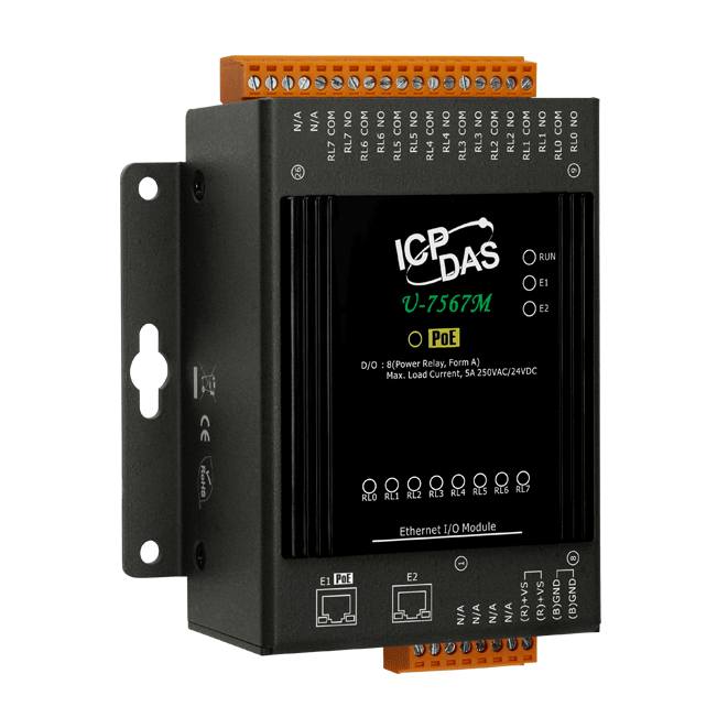 OPC UA I/O Module with 8-channels Power Relay 5A@250VAC/24 VDC and 2-port Ethernet Switch, 12-48VDC-in