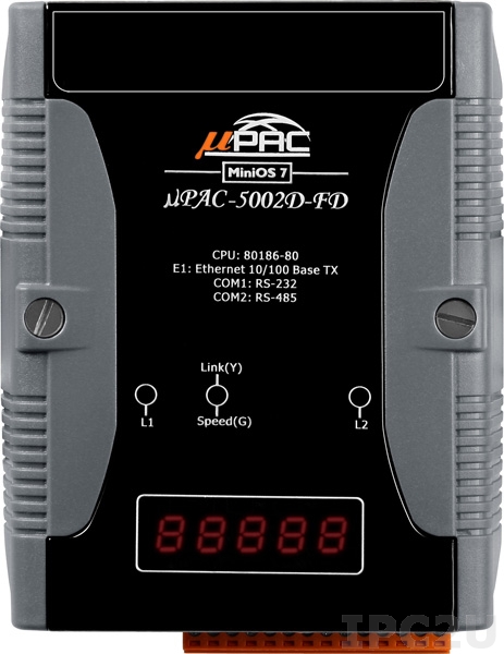 PC-compatible 80MHz Industrial Controller, 512KB Flash, 768KB SRAM, 16KB EEPROM, 31B NVRAM, microSD, 64 MB Flash, 1xRS232, 1xRS485, 1xFastLAN, LED display, 12-48 VDC