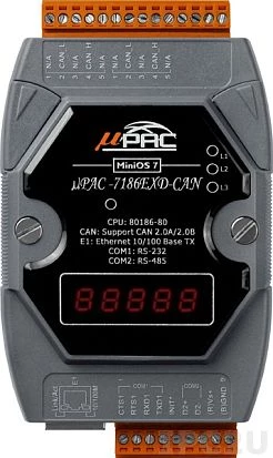 PC-compatible 80MHz Industrial Controller, 512kb Flash, 512kb SRAM, 1xRS232, 1xRS485, CAN, Ethernet, 7-Segment Display, MiniOS7