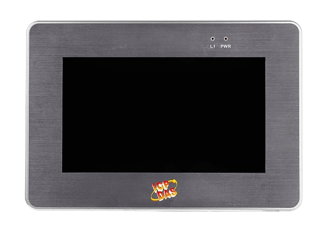 7" resistive touch HMI device with 32-bit RISC CPU, 64 MB SDRAM/64 MB Flash, 2xCOM, 1xEthernet, PoE IEEE 802.3af, 12...48VDC-in, NEMA 4/IP65 Front
