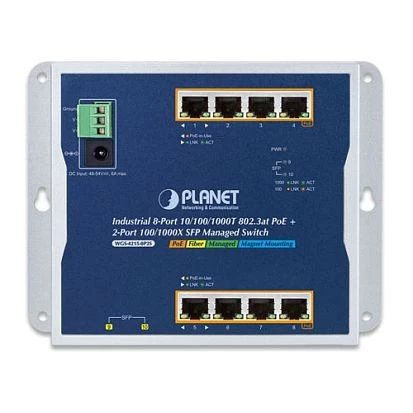 Industrial Managed Switch, IP30, 8x10/100/1000Base-T RJ45 ports with PoE+, 2x100/1000Base-X SFP, 48..54VDC In, -40..75C Operating Temperature