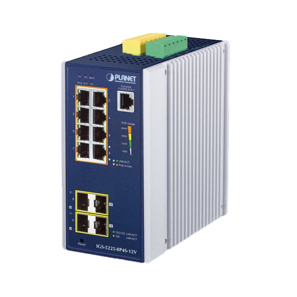 PLANET Technology has introduced the IGS-5225-8P4S-12V , a DIN-rail mountable, Layer 2+ managed Gigabit PoE+ switch designed to meet the demands of industrial environments. This robust switch offers advanced networking features, enhanced cybersecurity, and flexible power solutions, making it ideal for applications such as IP surveillance, wireless networks, and factory automation.
