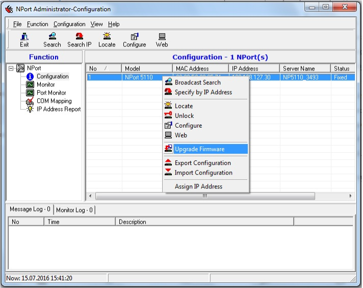 To launch the firmware upgrade, right-click on NPort and select Upgrade Firmware function.
