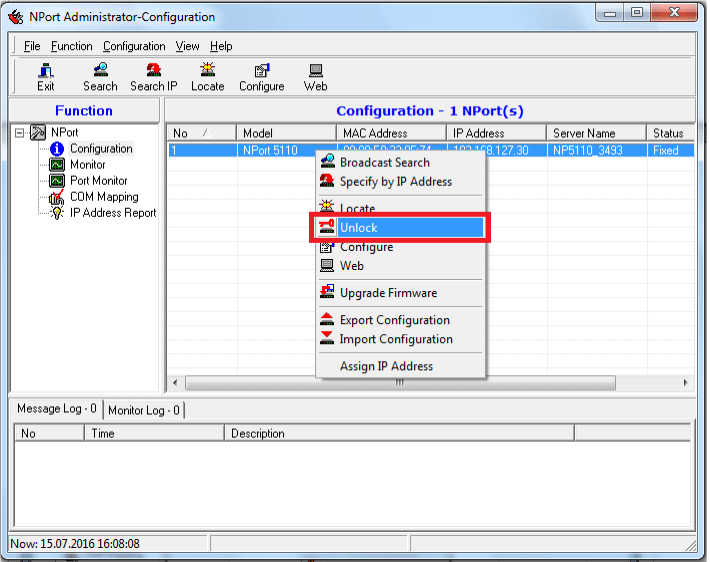 If NPort is protected by the password, it is required to unlock the device beforehand by selecting Unlock function.